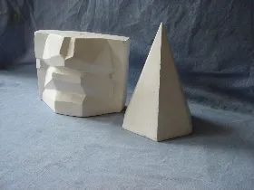 内容:五官分面石膏一个,与一个石膏几何体组合;背景为浅灰色衬布。