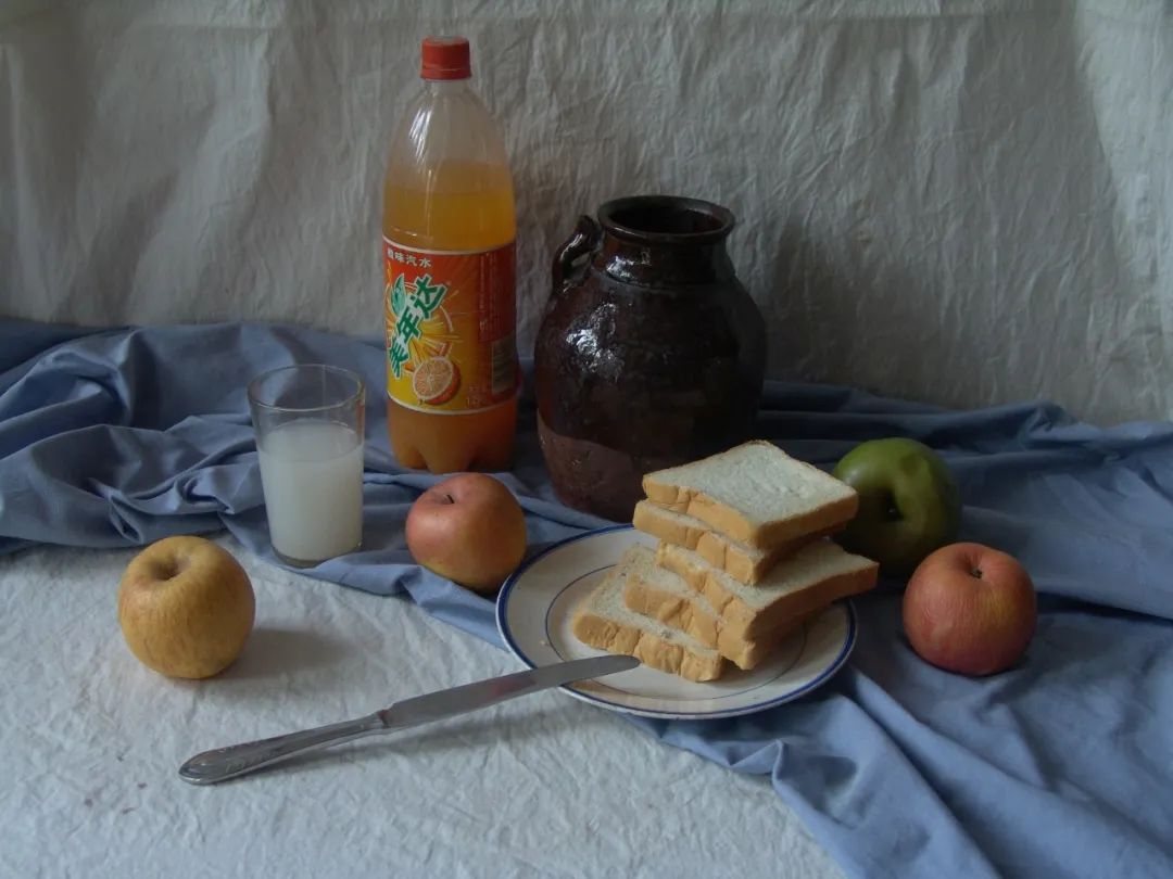 内容:白色、浅灰色衬布各一块;深色陶罐一只;汽水瓶一只;白瓷盘一只、不锈钢刀叉一把;玻璃杯一只、内盛白色水半杯;苹果四只。