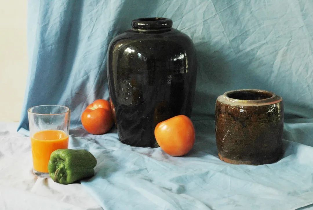 内容:深色、咖啡色陶罐各一;透明玻璃杯子一只;苹果、青椒一组;背景为灰色衬布。