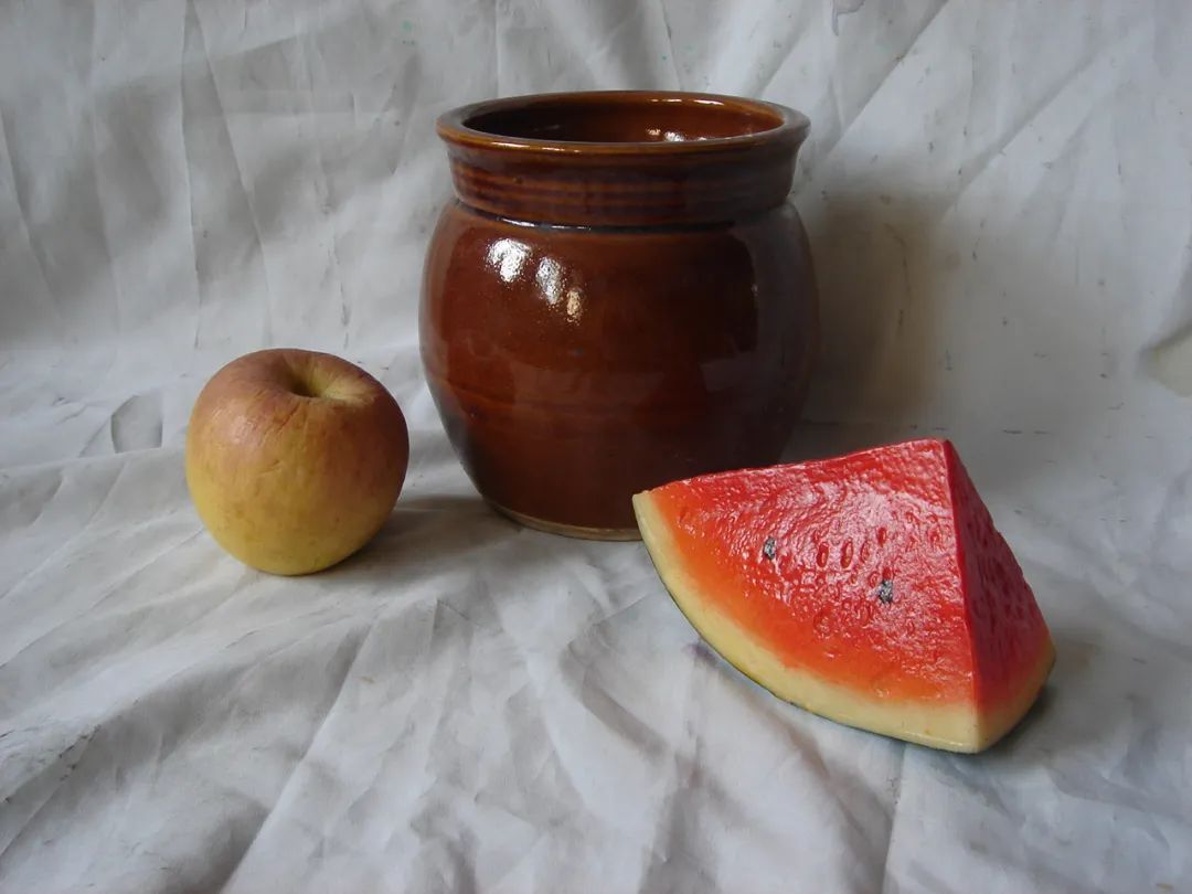 内容:白色衬布一块;深色陶罐一只;苹果一只、西瓜一块。