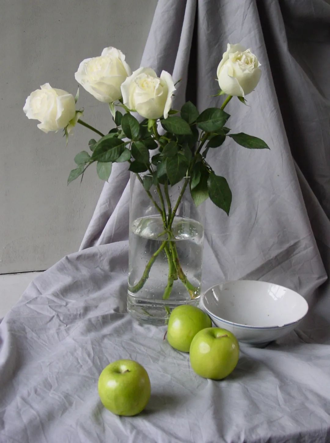 内容:深灰色衬布、浅灰色衬布各一块;大的透明玻璃花瓶一只;白色碗一只、浅色玫瑰花五支、青苹果三只。