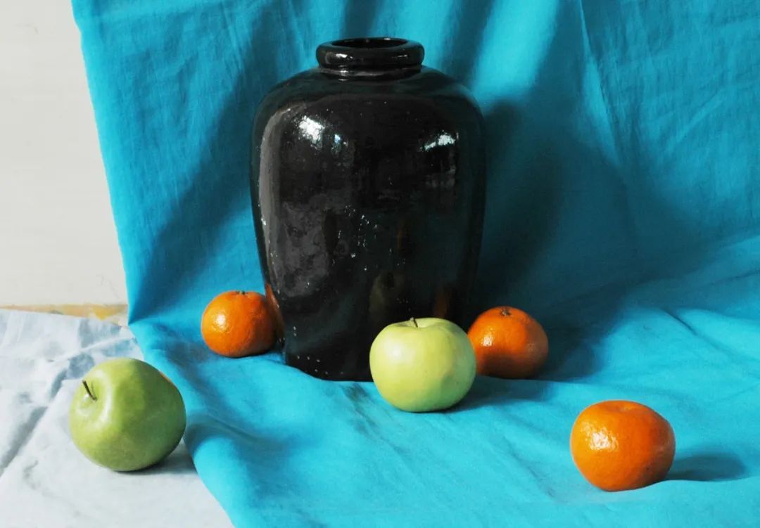 内容:蓝色、白色衬布各一块;深色、咖啡色陶罐各一;透明玻璃杯子一只;苹果二只、青椒一只。
