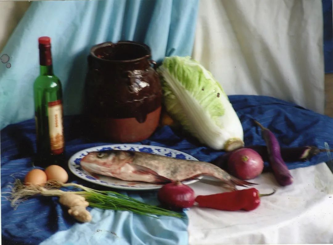 内容:白色、蓝灰衬布各一块;青花瓷盘一只、深色陶罐一只、绿色玻璃瓶一只;白菜一棵、鱼一条、洋葱二只、茄子两个、葱、姜;鸡蛋一组。