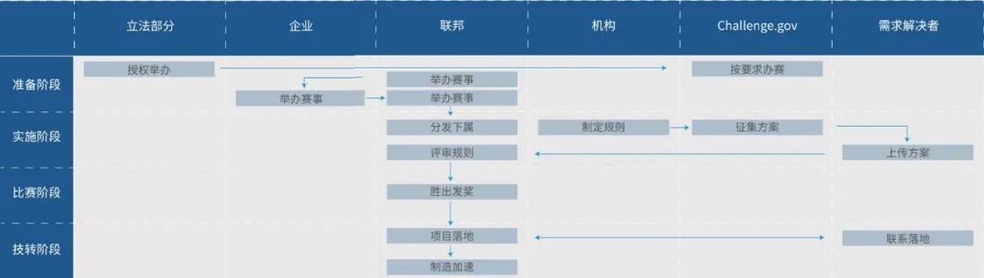 挑战赛由政府相关部门发布工作指南,各自设计相关赛事架构,包含5个基本环节:准备、开发、实施、奖励、技术转移,涉及企业、联邦政府相关部门、赛事主办参办机构、Challenge.gov网络平台、参赛者等主体,立法授权机构为挑战赛提供配套服务。