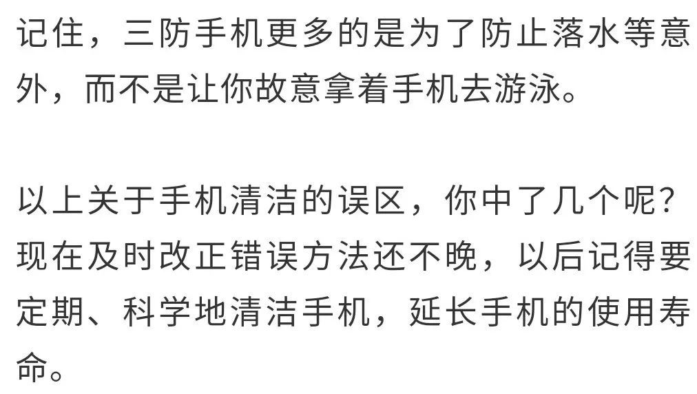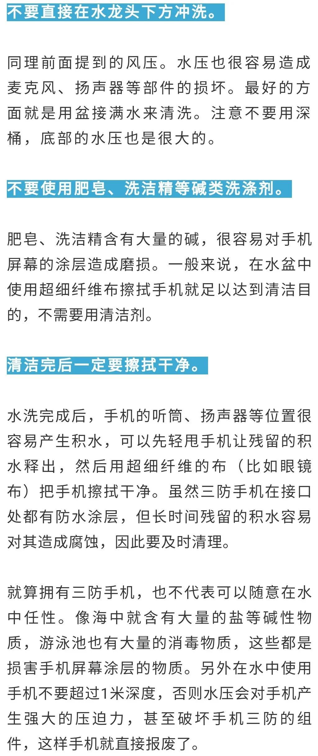 如果你有一部IP67安防标准以上的三防手机,对水有一定防护作用,可以用水进行清洁,但也要注意三点: