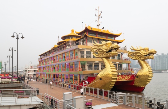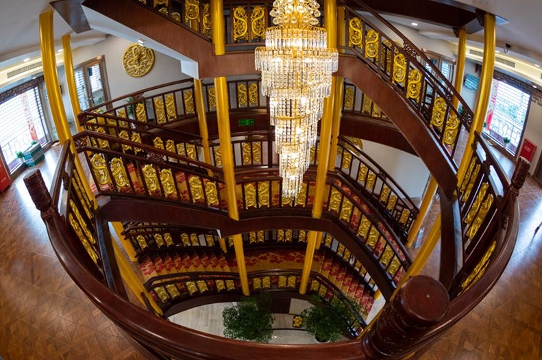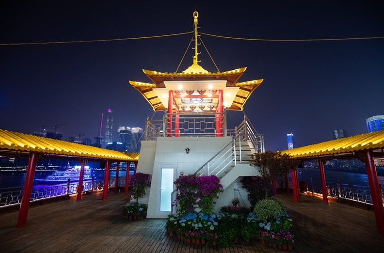 游船采用金色祥龙为设计基础,甲板上层建筑不仅有中国传统的亭台楼阁造型,还有烽火台、祈年殿等建筑,让游客在畅游浦江的同时品味游船上中国传统建筑和装饰的精华。