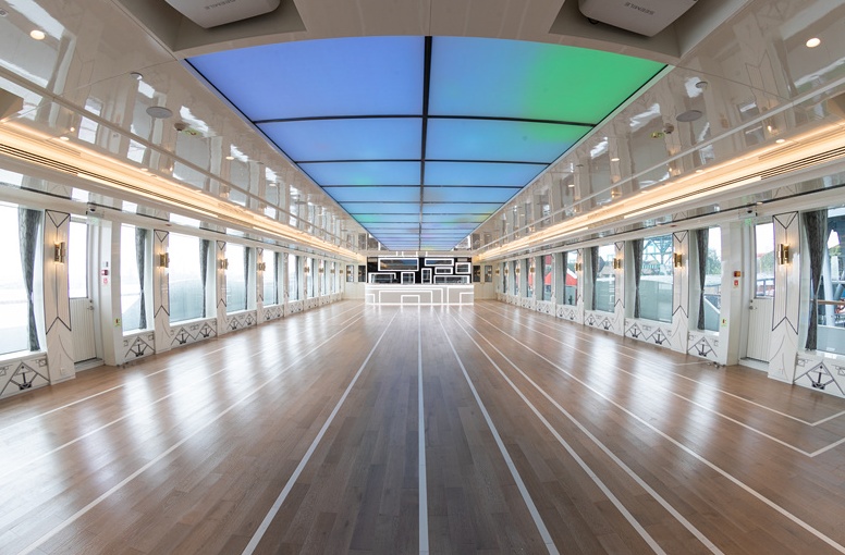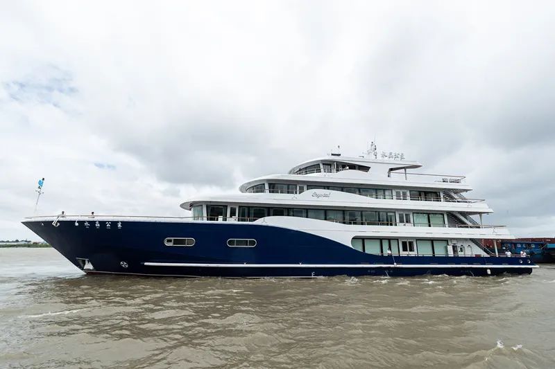 该船又名“水晶宫号”,船体通透,宛如一座“玻璃宫殿”,被誉为黄浦江上最具通透性的游船。游船采用隐型玻璃幕墙。全船上层建筑外围壁近500平方米的玻璃幕墙材料,采用双层夹胶钢化LOW—E玻璃,是目前国内使用玻璃面积最大的游船。