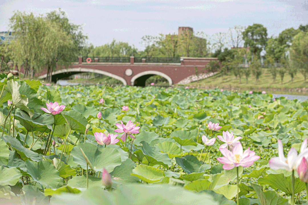 凉亭赏荷,饮茶消暑。晨暮时分,建桥凉亭下,一片荷塘,荷花正艳,微风拂过,莲叶莲花轻轻摇摆。静坐荷畔,闻着水上荷香在空中逸散,身心都得到放松。