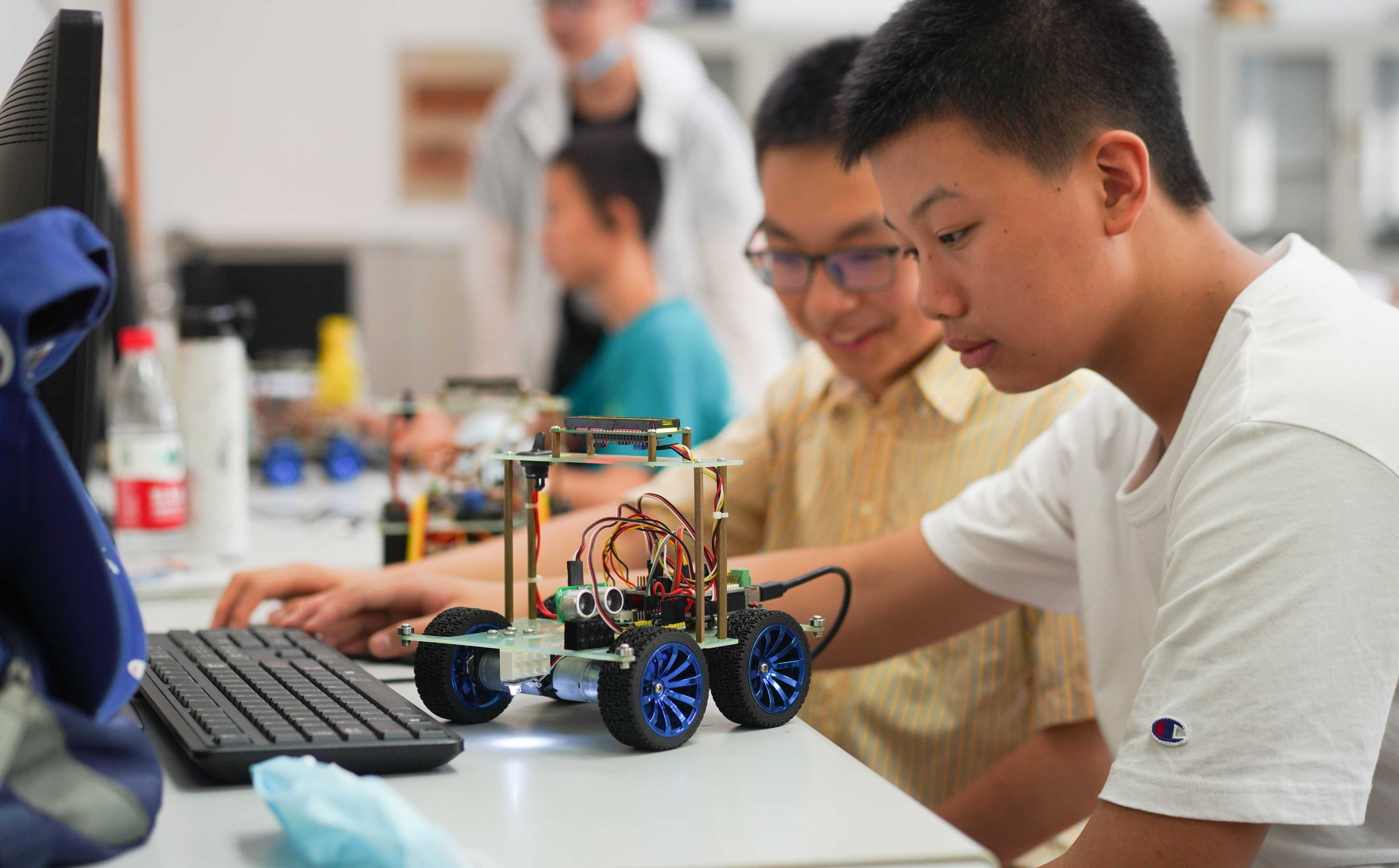 想象力和创造力,是孩子与生俱来的天赋,比起单单让孩子学习巩固文化知识,让他们利用暑假,在探索和实践中发现自己的兴趣,更能拓展自身的无限可能。黄浦区青少年科技活动中心智能控制机器人团队的孩子正在埋头钻研RCJ机器人竞赛实验。以两人为一组,同学们将综合任务逐一拆解细分,在此过程中培养团队协作和创新精神。