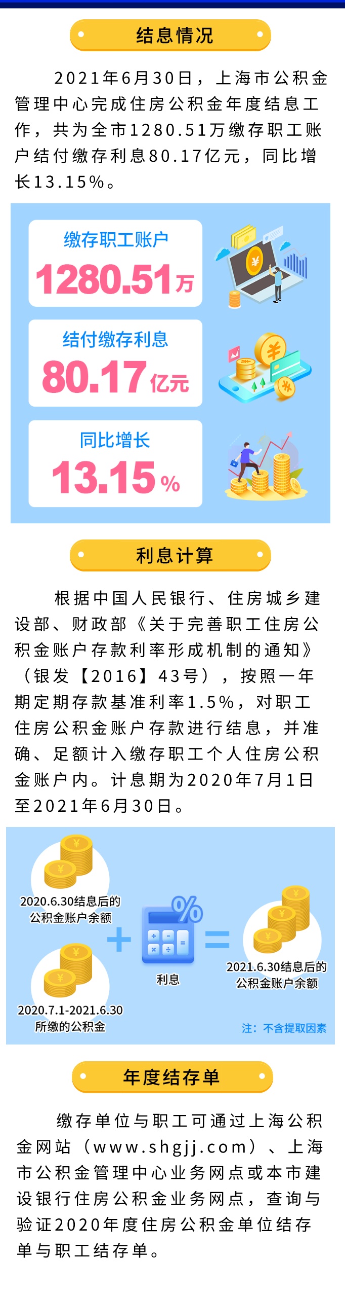 你知道吗?每年6月30日,住房公积金账户资金都会进行结息。市公积金管理中心说:本年度按照一年期定期存款基准利率1.5%,对公积金账户存款进行结息,共为全市1280.51万缴存职工账户结付缴存利息80.17亿元。大家可登录www.shgjj.com,致电12329,点击随申办小程序或小布微信“市政大厅”等查询,看看你的公积金利息有多少?