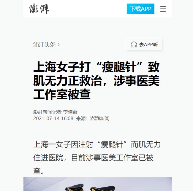 7月14日,据澎湃新闻报道,黄浦区卫健委监督所日前成功取缔一个藏匿在商务楼宇的非法医美工作室,一个女子在这个工作室注射瘦腿针产生了严重肌无力,目前还在医院救治。