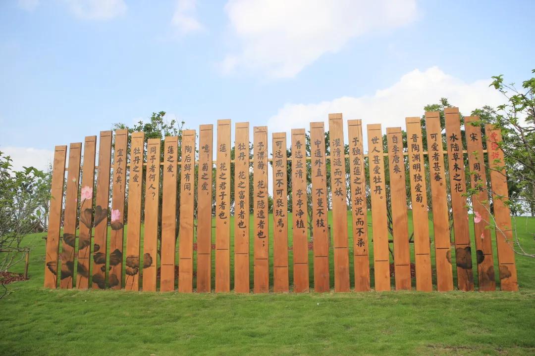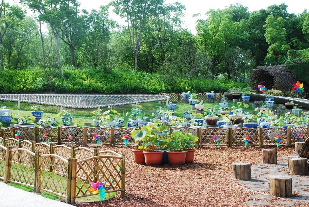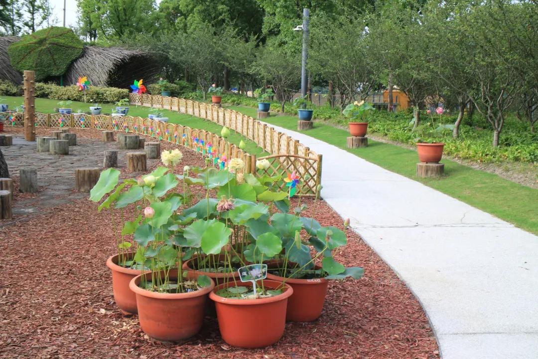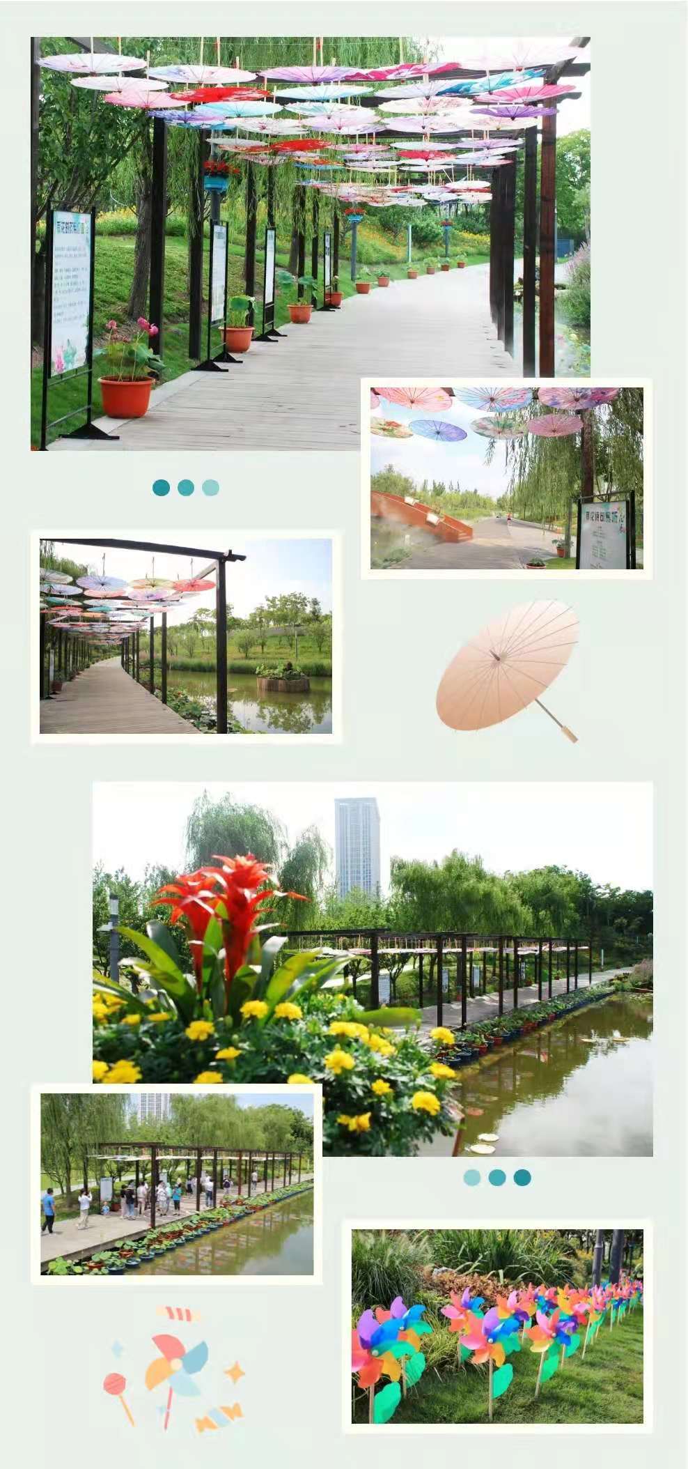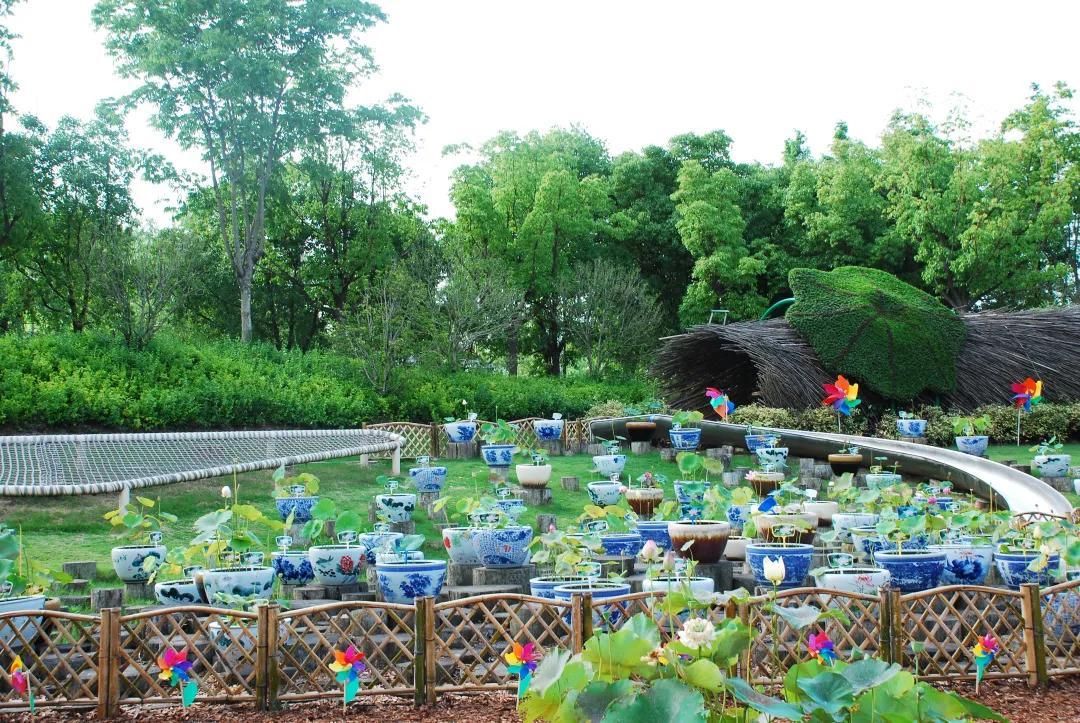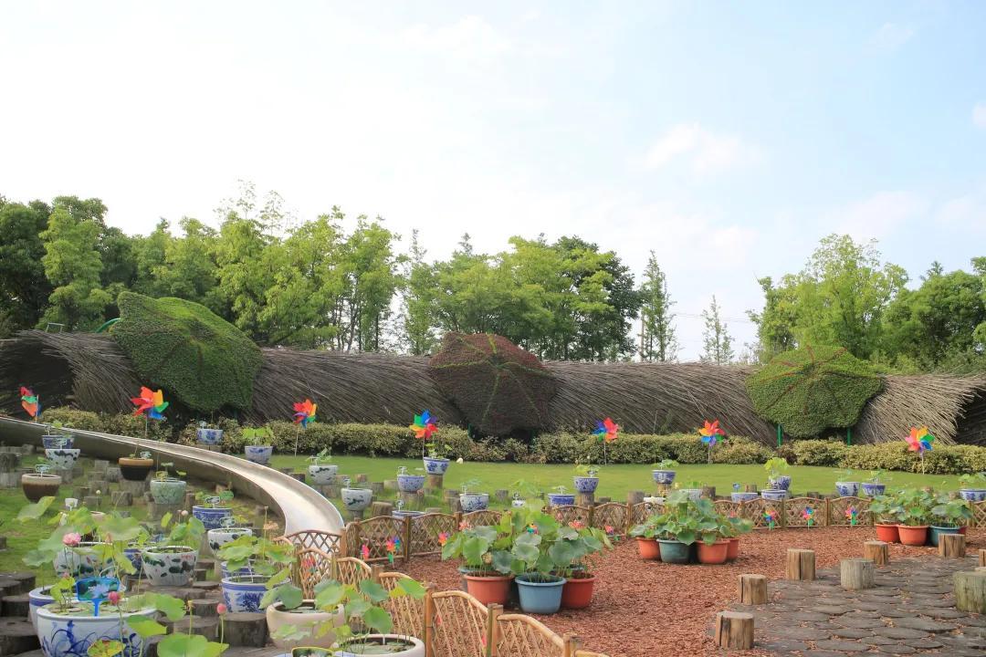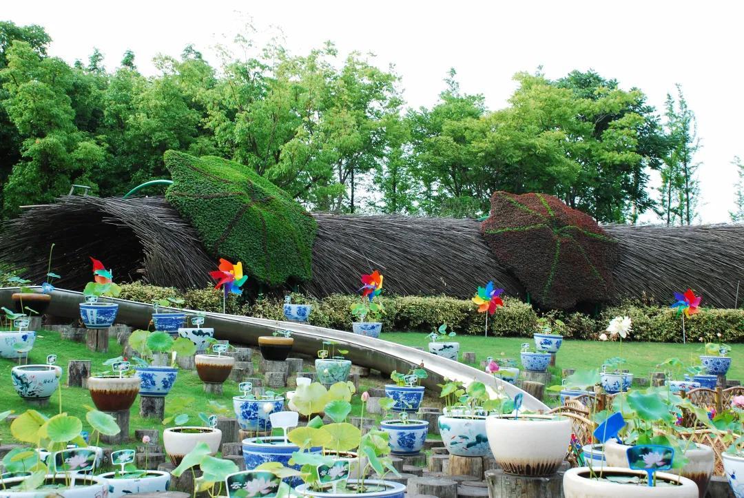 毛毛虫乐园内,由荷花、孔雀草及红绿草立体花坛组合而成的大型荷花绿雕,无需浓墨重彩,自得淡墨水色。一组竹篱笆曲折蜿蜒,包围着108盆瓷盆精品荷花,留下无数荷花倩影和美丽传说。桥顶部《爱莲说》书简朴实素雅,将莲的品质娓娓道来。此外,花展上还放置了一百余个各色装饰伞、五百多个地插风车,进一步衬托氛围。