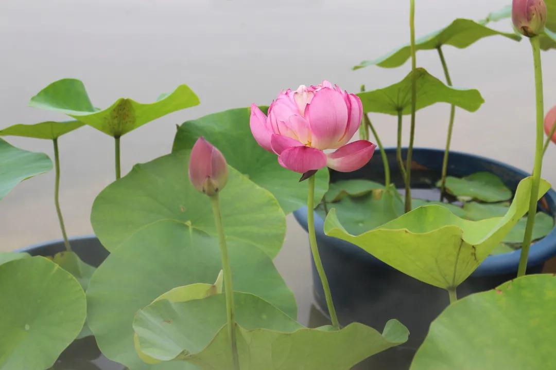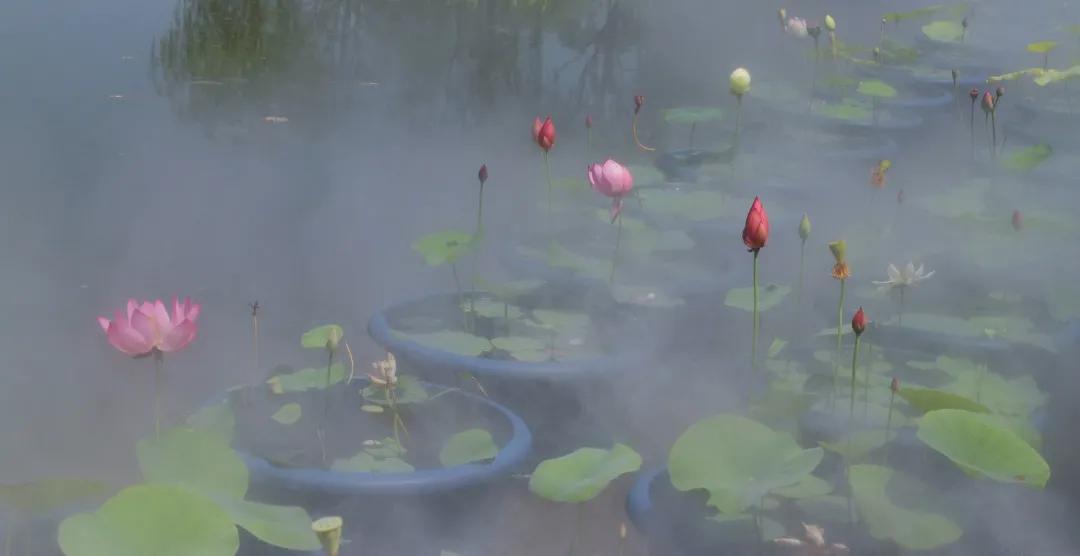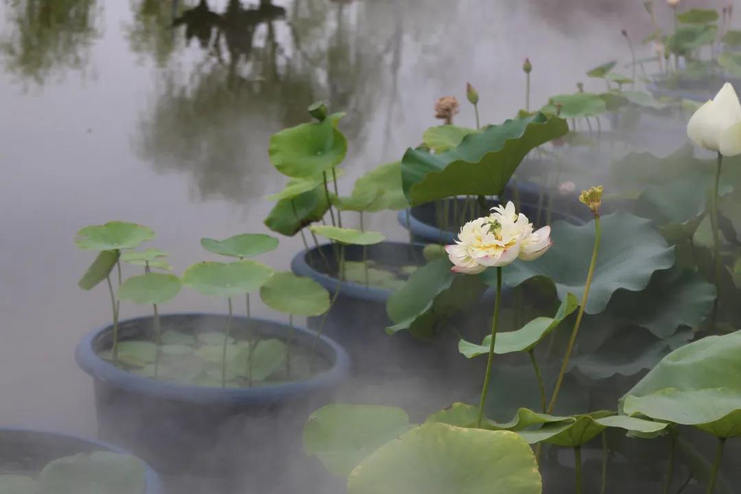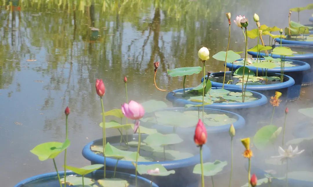 “金丝猴”“光岳楼”“至尊千瓣”花瓣硕大、长势良好,通过雾蒙蒙的水气,隐约可见纤尘不染的荷花立于微波上,摇曳生姿,好似“凌波仙子”。荷花展主路与副路交汇处,以红绿草为立面构架,巨大的叶柄托举着或含苞待放或半闭半开的荷花,诗人笔下“清水出芙蓉,天然去雕饰”的画面呼之欲出,平面则由鸡冠花、孔雀草等时令花卉形成错落有致的花境,寓意着人民的生活将更加缤纷多彩、幸福美好。