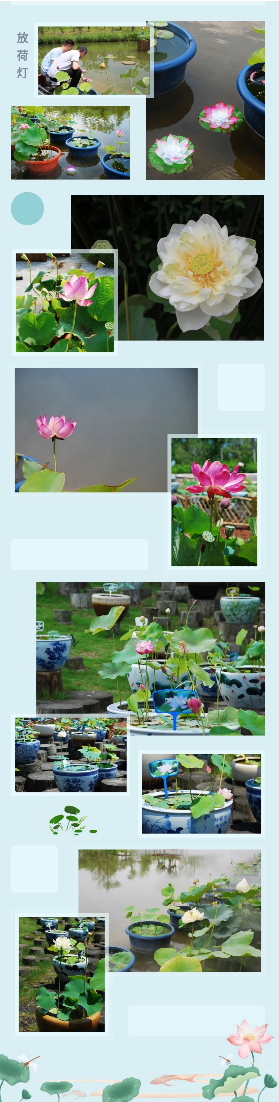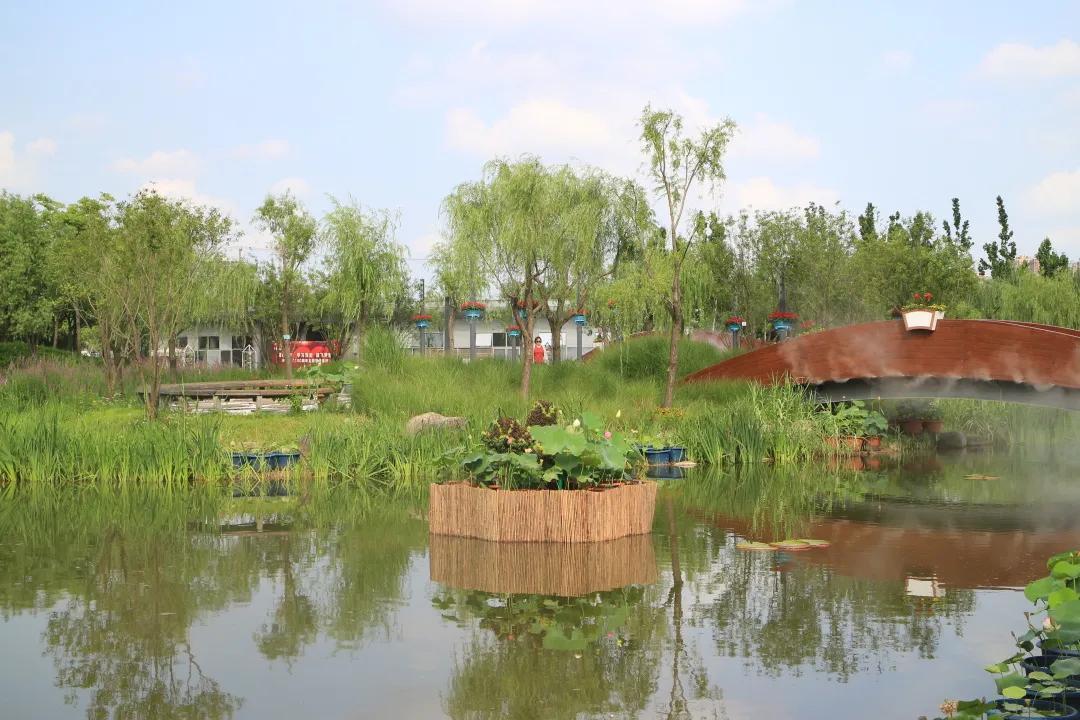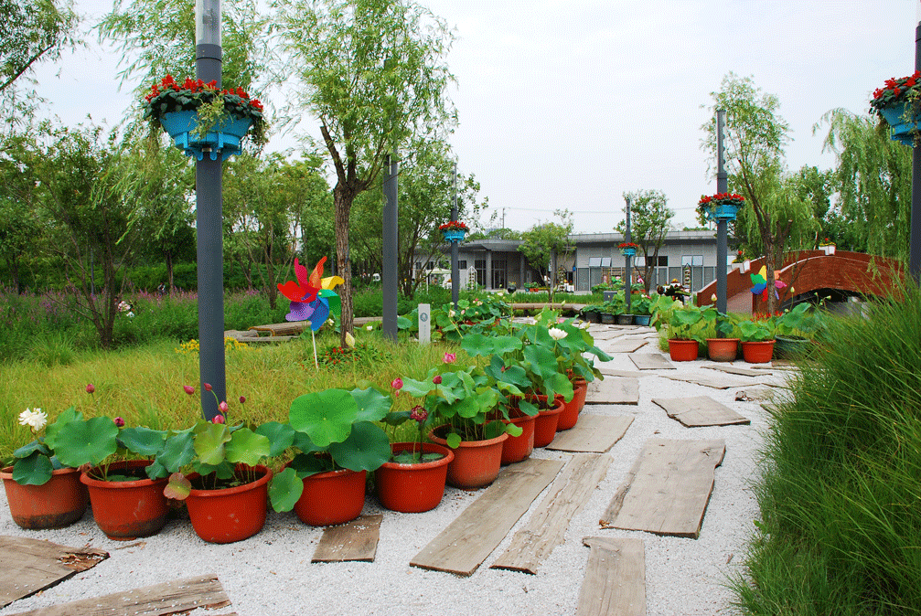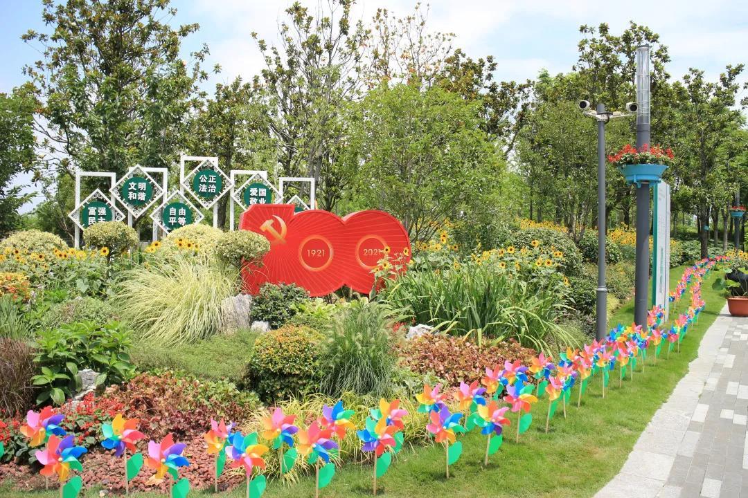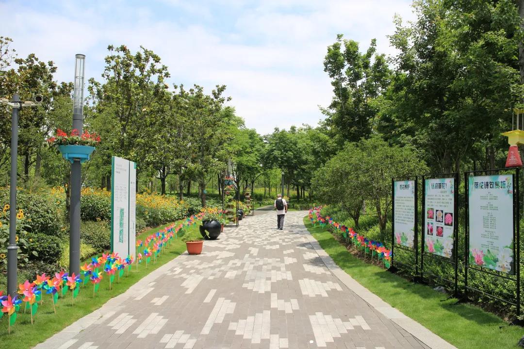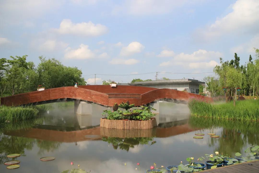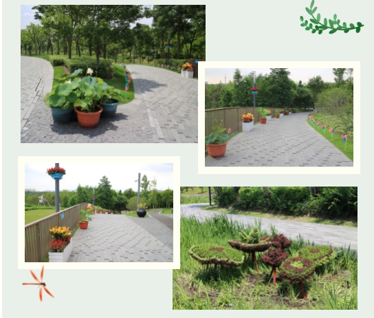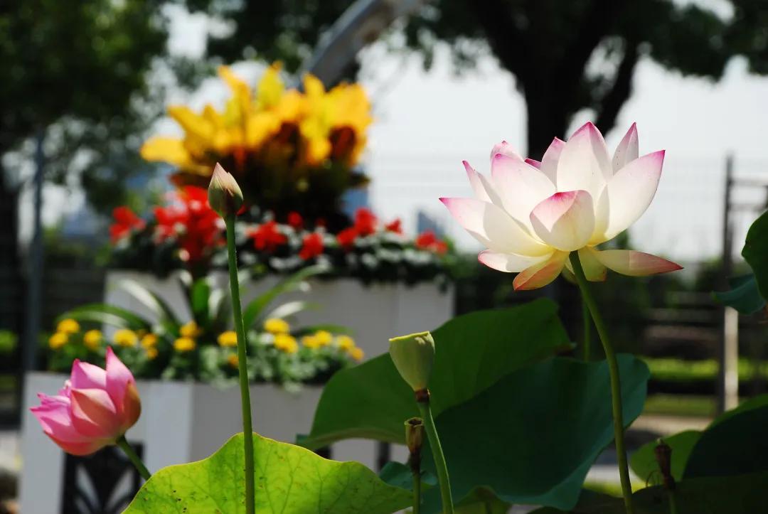 绿地入口处由红绿草组成荷花形门头配以各种当季花卉组成花柱,在拱门底角处放置绣球和荷花,营造出百花齐放的热烈景象,欢迎八方游客。婀娜多姿的荷花色彩丰富,惹人怜爱,粉得娇嫩、绿得葱茏、白得剔透,争相恐后从水下探出来,舒展枝叶,迎风起舞。