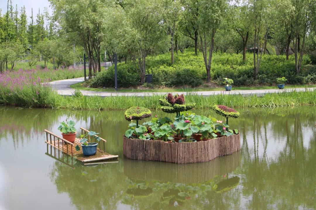 本次花展的水中景点层次丰富、别有趣味,中心湖区由生态浮床、荷花、红绿草立体花坛、鸡冠花、孔雀草、竹筏等组成多个观赏景观,让游客们切实感受到“出污泥而不染,濯清涟而不妖”君子之花的美态。如能在碧湖上泛舟,拨开层层叠叠的荷叶,船桨划过细细波纹,就能见由孔雀草、一串红、鸡冠花构成的植物雕塑,好一派天真烂漫、宁静致远的景象。
