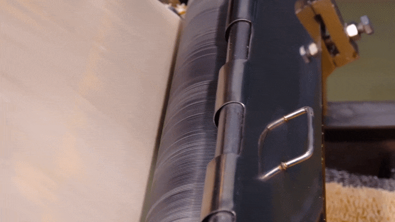 这是一个切条折花装置,当薄如蝉翼的面带通过这里时,它首先会被切成宽度一致的面条,随后经过一个长方形的成型导箱。在这里,面条会与导箱内前后壁发生碰撞,然后开始变得卷曲起来。