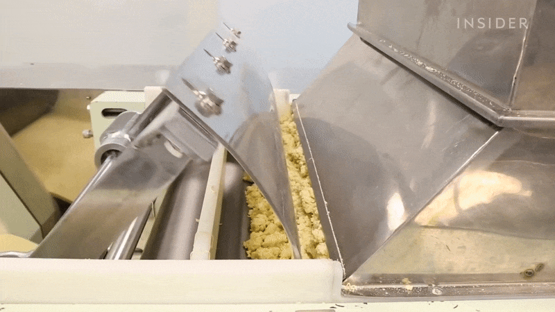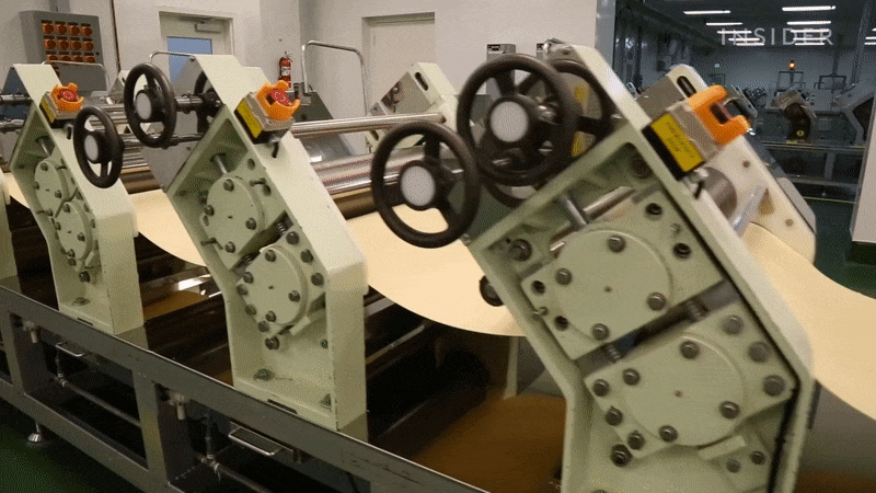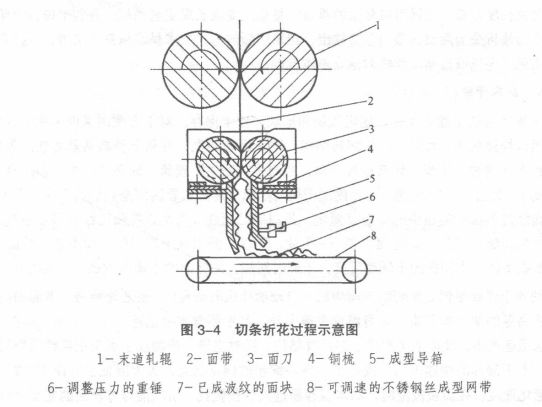 不过,上面的几个步骤,与直筒挂面的制作工艺没有太大的区别,让方便面真正变弯的关键还是在于切条折花环节。