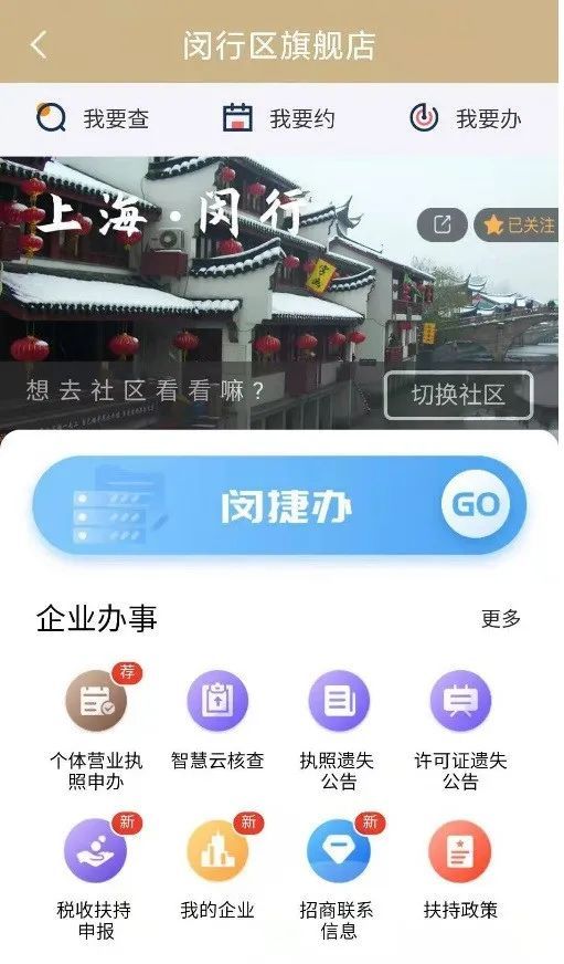 打开随申办APP,进入发现频道,在城市风采中找到“闵行旗舰店”,或者直接在页面顶端搜索“闵行旗舰店”,进入“闵行旗舰店”主页,在企业办事栏目下,就可以找到它们啦。