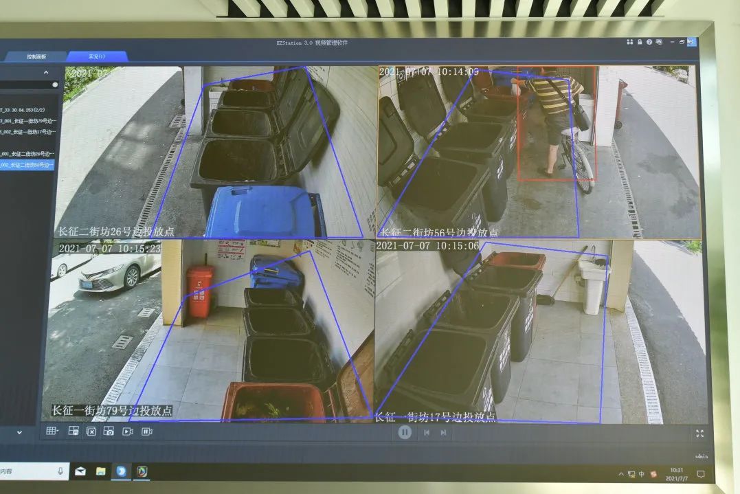 这套智能声光报警监控系统的亮点要归功于电子围栏,在监控范围内,当居民进行垃圾分类投放时,摄像头会自动发出声光,同时进行语音播报,提醒居民正确投放垃圾。系统还能远程监测到垃圾桶溢满情况,便于提醒工作人员及时到场进行清运工作。