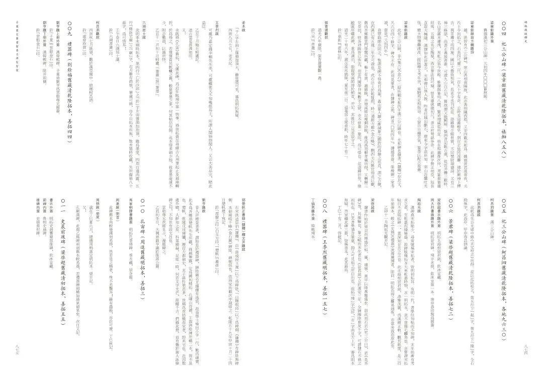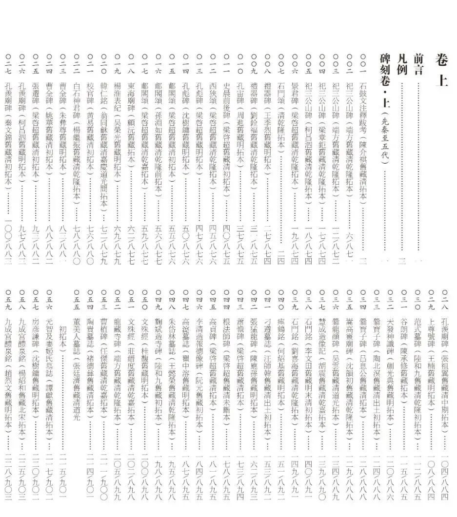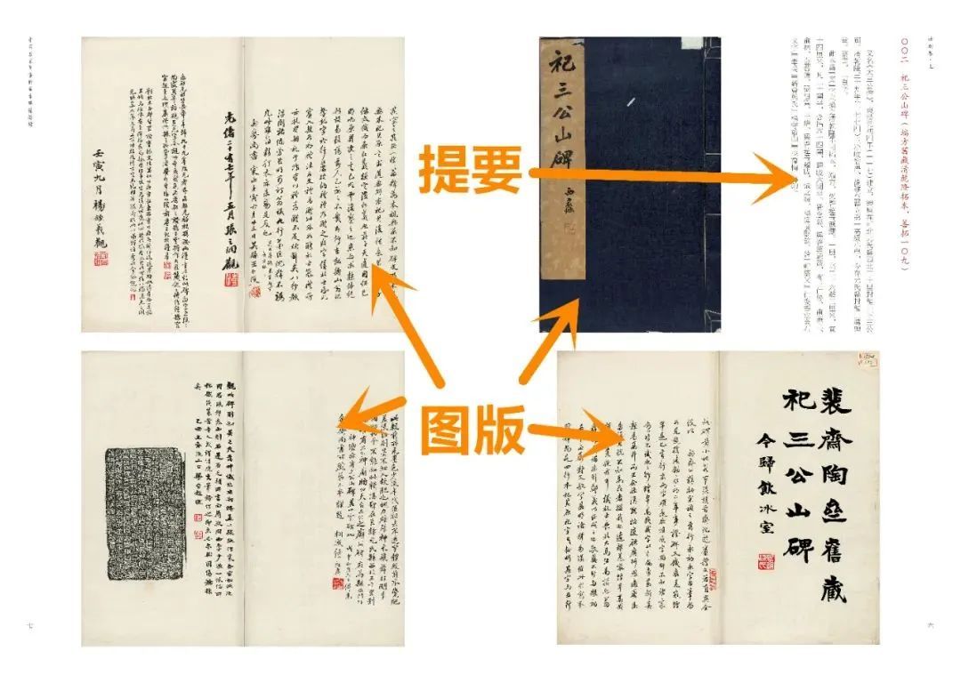 每种提要包括题名,镌刻时间,刻立石地点,责任者,碑刻行款,后人附刻,拓本尺寸、数量,拓本年代、类型、装潢形式,拓本收藏沿革、题签、题跋、观款、绘图等情况。