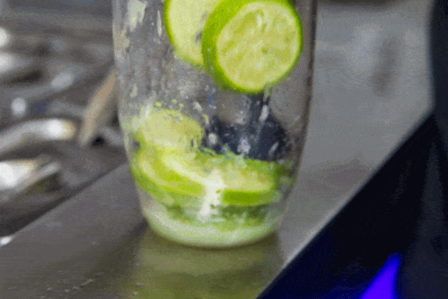 用擀面杖或者其他工具敲打冰块和柠檬片。