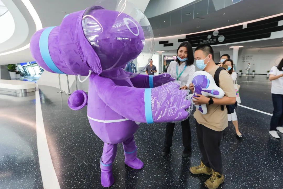 进入场馆内,这位18岁的科普“资深粉”,还得到了天文馆吉祥物“科飞”的热情拥抱,还有馆方精心准备的大礼包。