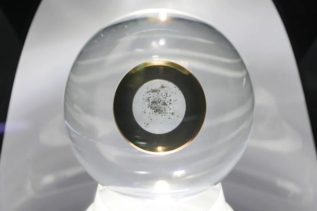 开放首日,由嫦娥五号带回的珍贵月壤样品在 “征程”展区内备受瞩目。这一编号为007的“天外来物”被封装在水晶球中,吸引了观众近距离观看。