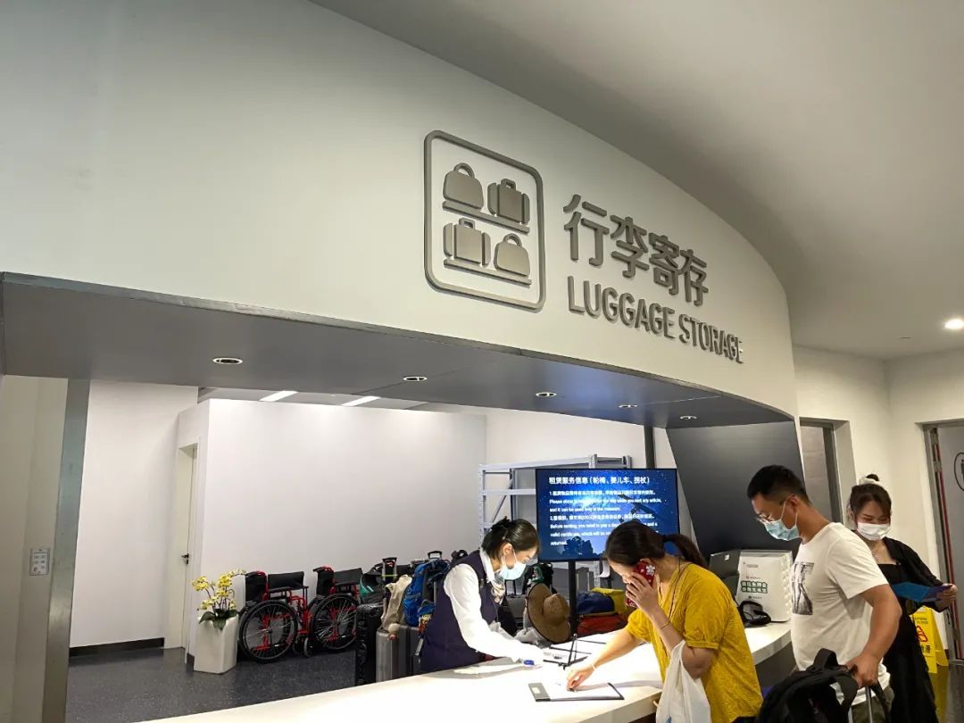 在排队入口处,考虑到高温天气,馆方配置了遮阳伞。进入馆内,不少家长还带着大包小包的行李及儿童推车,位于一楼出口处附近的行李寄存点全面开放,下午四点前可随时存入取出。