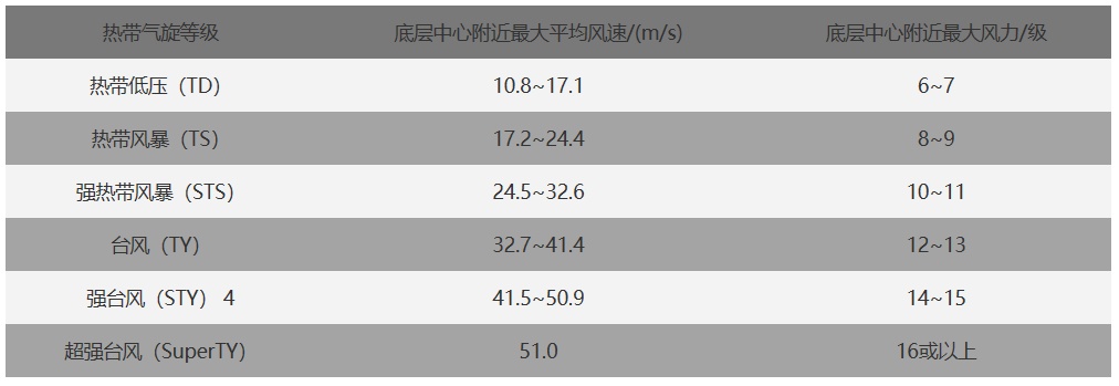 热带气旋分为热带低压、热带风暴、强热带风暴、台风、强台风和超强台风六个等级。