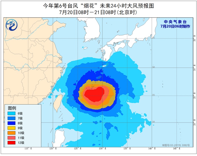 今年第6号台风“烟花”(强热带风暴级)的中心今天(20日)早晨5点钟位于我国台湾省宜兰县偏东方向大约920公里的西北太平洋洋面上,就是北纬24.2度,东经130.8度,中心附近最大风力有11级(30米/秒),中心最低气压为980百帕,七级风圈半径为180-300公里,十级风圈半径为60公里。
