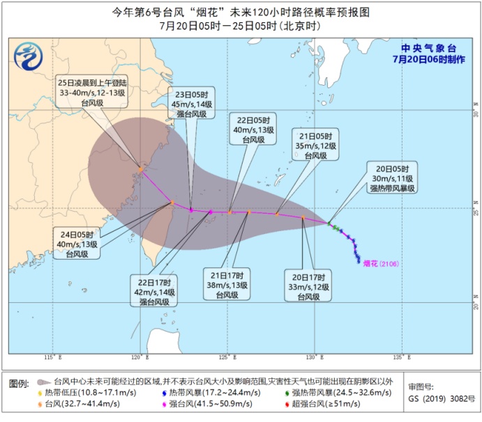预计,“烟花”将以每小时10-15公里的速度向偏西方向移动,强度逐渐加强,最强可达台风级或强台风级(13-15级,40-48米/秒),21日夜间或22日凌晨移入东海海面,有可能擦过台湾岛北部,然后逐渐向浙闽沿海靠近,并于25日凌晨到上午在浙闽沿海登陆(台风级,12-13级,33-40米/秒)。