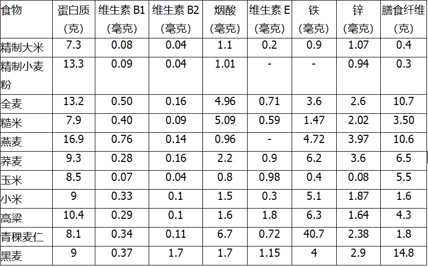 精细谷物和全谷物营养成分比较(每100克可食部分)