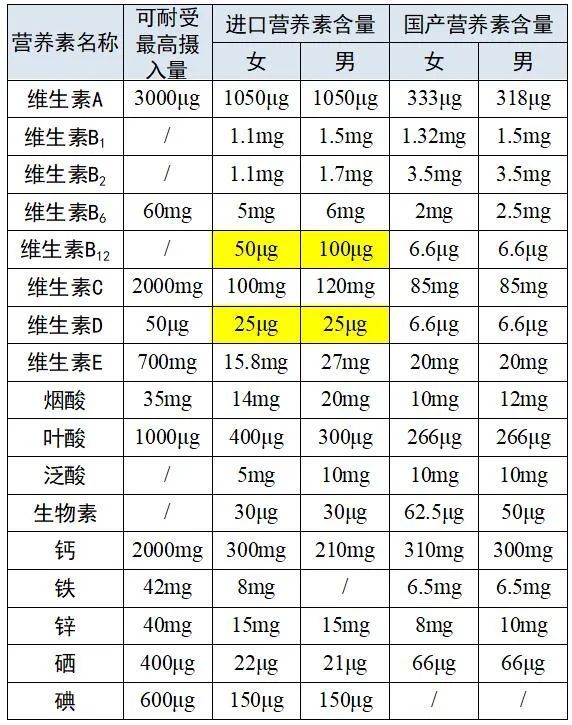 不难看出标黄的两个营养素,维生素B12和维生素D,B品牌进口版和国产版的每日推荐摄入量还是有差异的,虽然都没有超过可耐受最高摄入量,但进口版的含量都远高于我国的每日推荐摄入量。