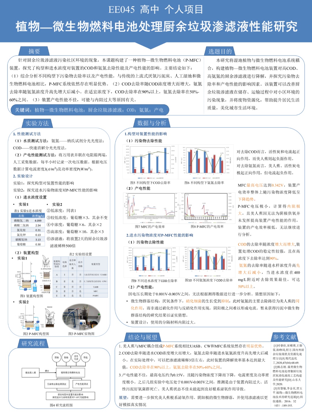 本研究旨在将湿地植物美人蕉与微生物燃料电池系统(MFC)耦合,设计一种植物—微生物燃料电池(P-MFC)装置处理小区垃圾房中产生的厨余垃圾渗滤液,以改善垃圾房对小区环境的污染并提升居民生活质量。