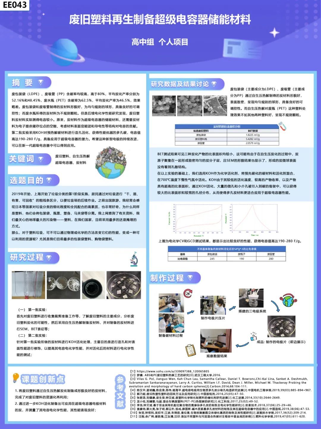 传统处理废旧塑料的方法是直接焚烧,然而这种方法只能从废塑料中回收少量热能、资源化利用水平较低。本实验创新地采用自生压力热解方式对废塑料进行处理得到微颗粒炭,并对产生的炭材料进行SEM、BET、电化学测试,从而探究不同塑料产生的炭材料在应用于超级电容器上的可行性。