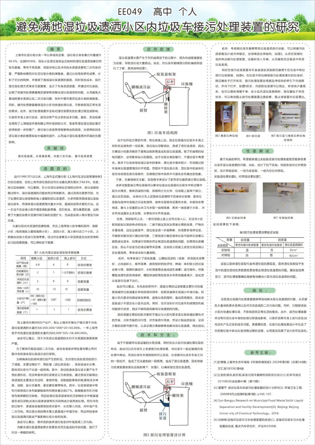 通过比较现有研究成果,分析了它们的利弊,梳理了造成湿垃圾遗洒的原因,同时综合成本、现行湿垃圾处理方式等多方面要素,设计了车身改进装置,并通过对比实验,证明了该接污处理装置确实能够有效解决湿垃圾遗洒的问题,从而避免大量地耗费水资源以及二次污染问题,有利于提升居民垃圾分类的满意度。