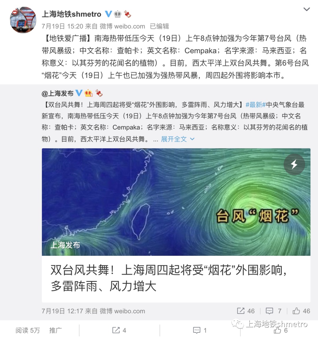 台风期间,上海地铁将密切关注防汛防台预警信息,并及时做好运营情况告知、现场解释工作。通过地铁服务热线、乘客显示屏、地铁电视、电台、官网、微博、微信、官方APP、车站广播等平台及时第一时间向乘客、社会发布各类运营信息。
