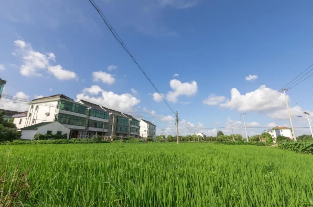 蓝天白云给一片片绿色的稻田与特色民居画上了一抹亮丽的色彩。