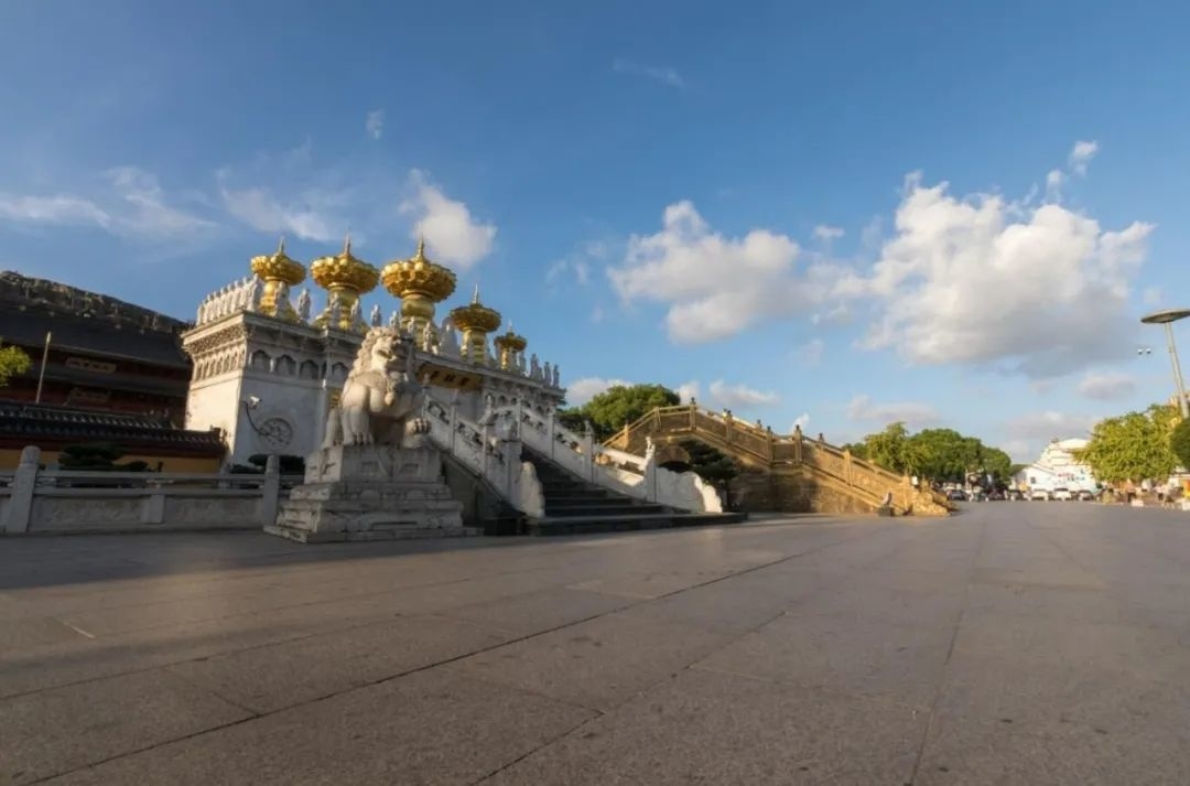 东林寺在夕阳的照样下,金光闪闪;在航拍的画面中,天空风起云涌,河面泛起的微光,反射出夕阳的景色,伴着逐渐浓重的夜色一起落幕。