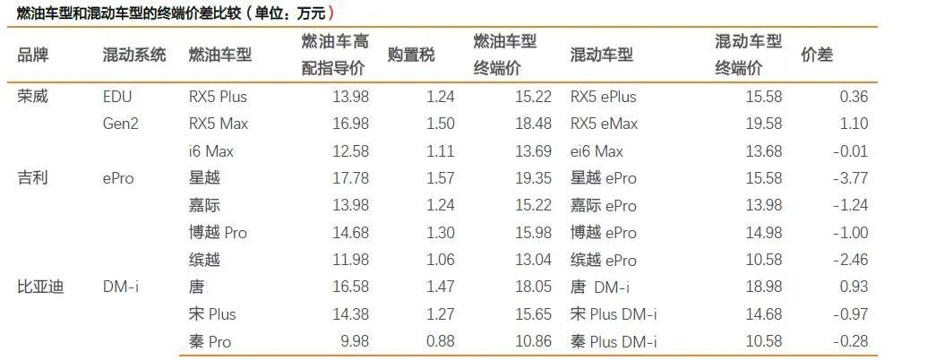 据不完全统计,搭载上汽、吉利和比亚迪混动专用架构的混合动力汽车,部分入门级车型的价格已经低于传统燃油车型(考虑到新能源汽车免征购置税以及国家补贴后价格)。例如,荣威ei6 Max(混动)就比传统燃油版车型i6 Max便宜100元;吉利星越ePro比传统燃油版便宜3.77万元。