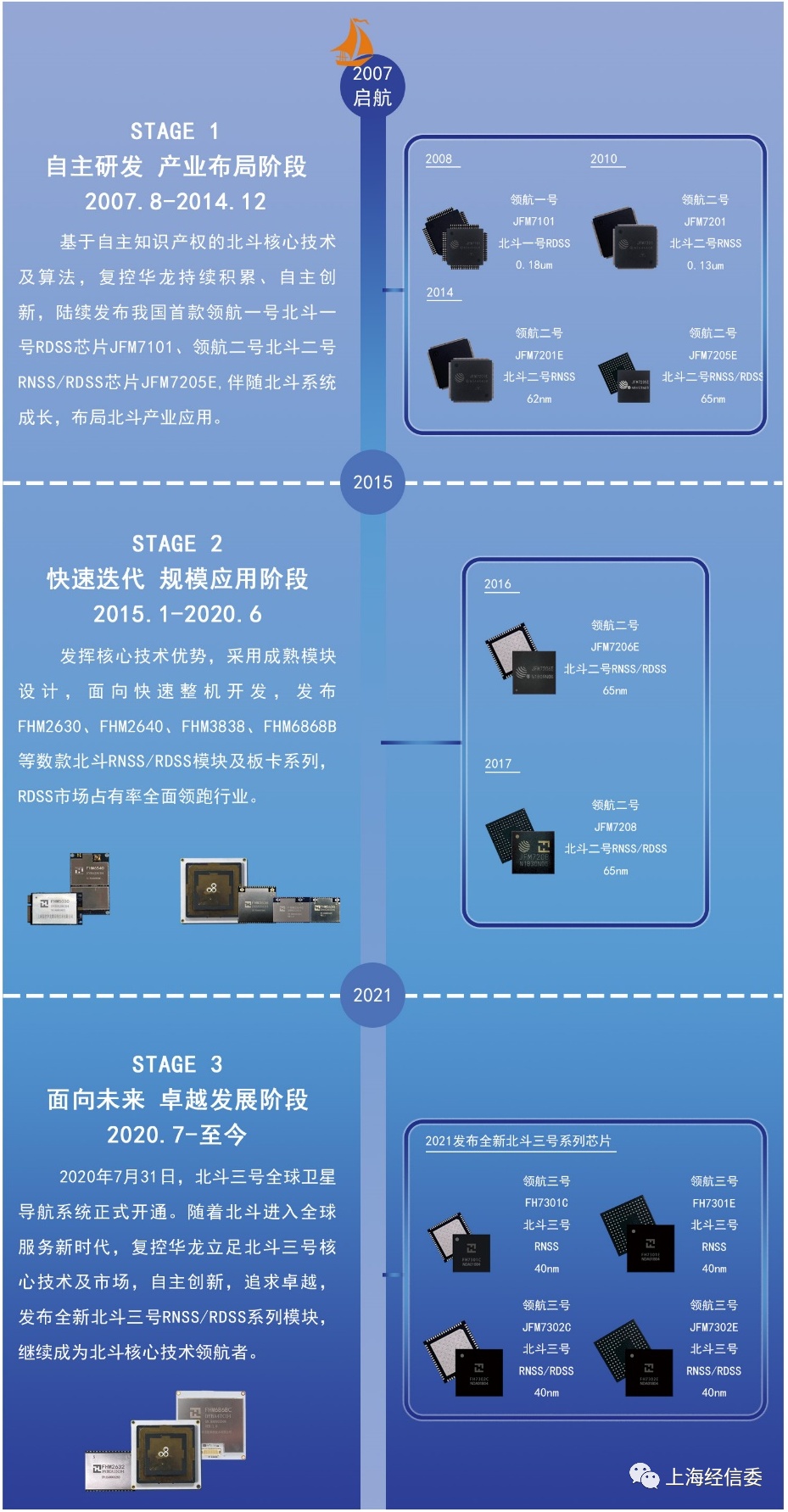 2008年,上海复控华龙微系统技术有限公司发布了国内首款北斗一号RDSS处理芯片——“领航一号”(JFM7101)。此后十余年,复控华龙又先后发布了JFM7201、JFM7205、JFM7206、JFM7208等多款北斗二号基带处理芯片,以及FH7301和FH7302两款北斗三号基带处理芯片。JFM7208、FH7301、FH7302都同时支持北斗、GPS、GLONASS、GALILEO四大全球导航系统,广泛应用于北斗短报文通信、定位、导航和授时等各类应用。