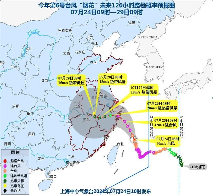 预计“烟花”将以每小时15公里左右的速度向北偏西方向移动,强度变化不大,逐渐向浙江中北部沿海靠近,最大可能将于25日下午到26日凌晨在浙江舟山到象山沿海一带登陆,登陆后强度逐渐减弱,并有可能在华东地区回旋。24日至26日会给本市带来明显风雨影响。