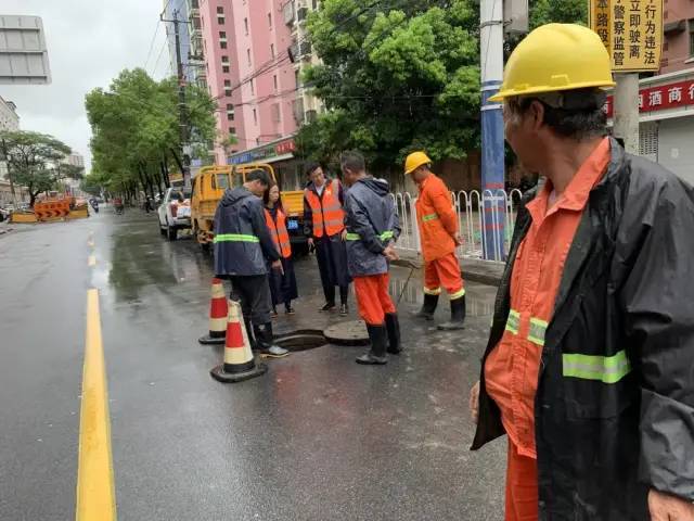 该现象一经发现,环卫工作人员立刻对道路两侧排水口进行疏通,同时,梅陇城投防台防汛应急小组立即出动,组织人员前往现场进行抢修,将窨井内的溢出污水及时抽出,顺利排放,仅用一小时,就解除了道路路面积水问题,恢复路面整洁。