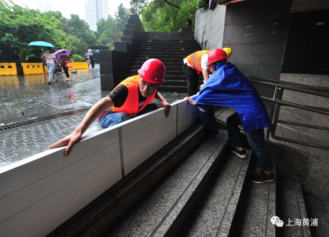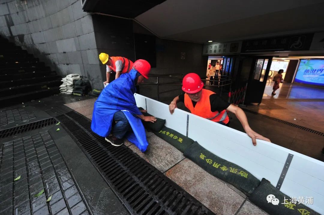 台风烟花外围带来了大风暴雨,为防止雨水积水倒灌,南京西路新世界下沉式广场围起了临时挡板,确保万无一失。