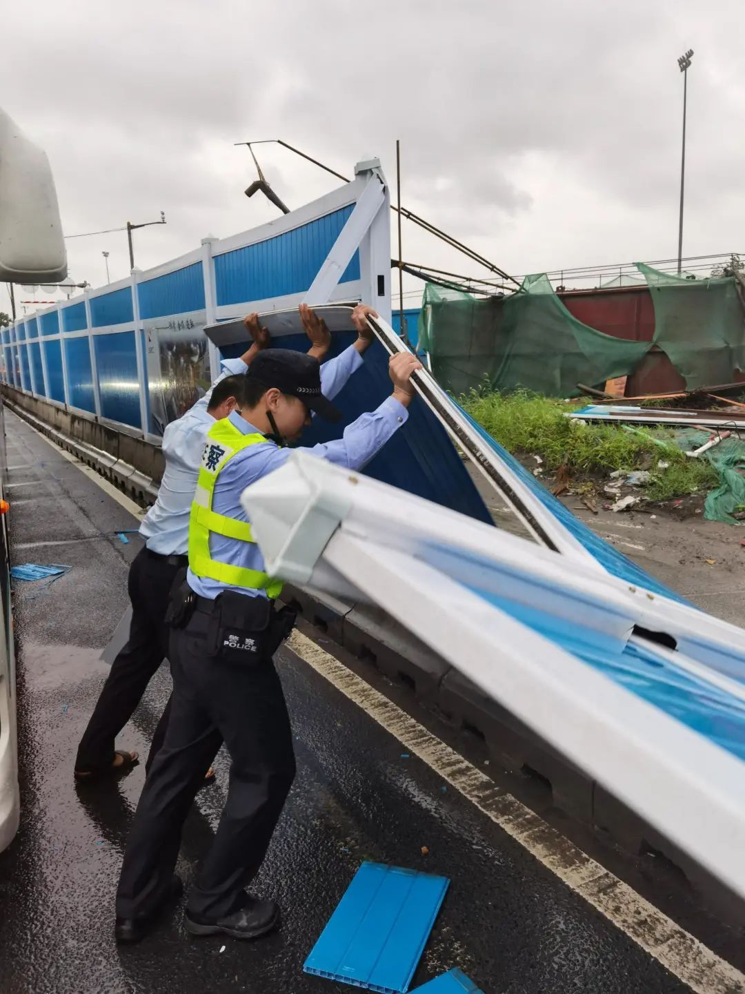 交警支队高速大队民警在巡逻中发现有施工区域的围挡被大风吹倒,影响后方车辆通行。民警立即对倾倒的围挡进行处理,同时告知施工单位对所有围挡进行加固。