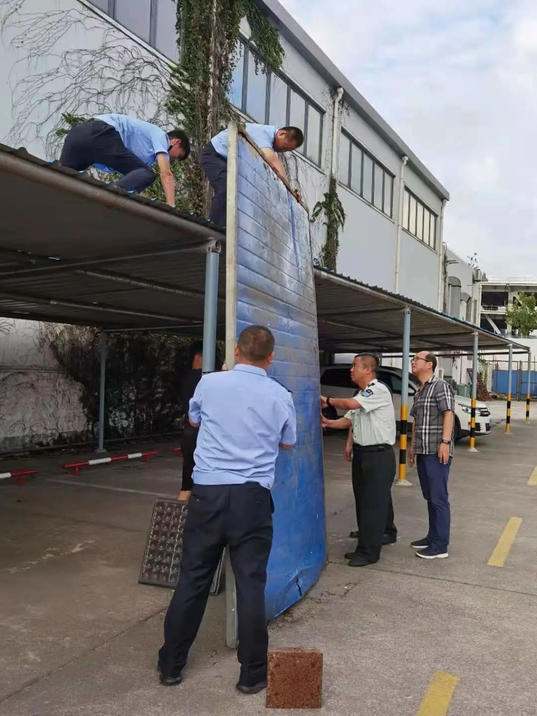 宝钢所在台风来临前,对辖区内雨棚、交通指示牌进行加固。