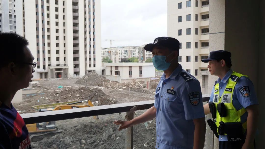 吴淞所民警对沿街居民家窗外花盆、遮阳棚等进行安全检查,提醒居民将窗外物品收入屋内。