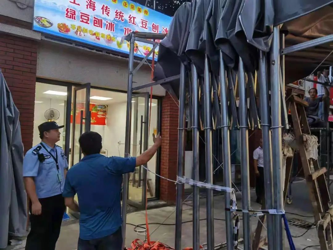 泗塘所在台风来临前,对辖区内搭有雨棚的商铺进行检查,告知商家将雨棚收起并搬入室内,谨防被大风吹走引发事故。