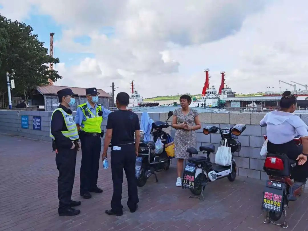 滨江所民警在码头开展巡查工作,提醒市民注意安全,加强个人防护。