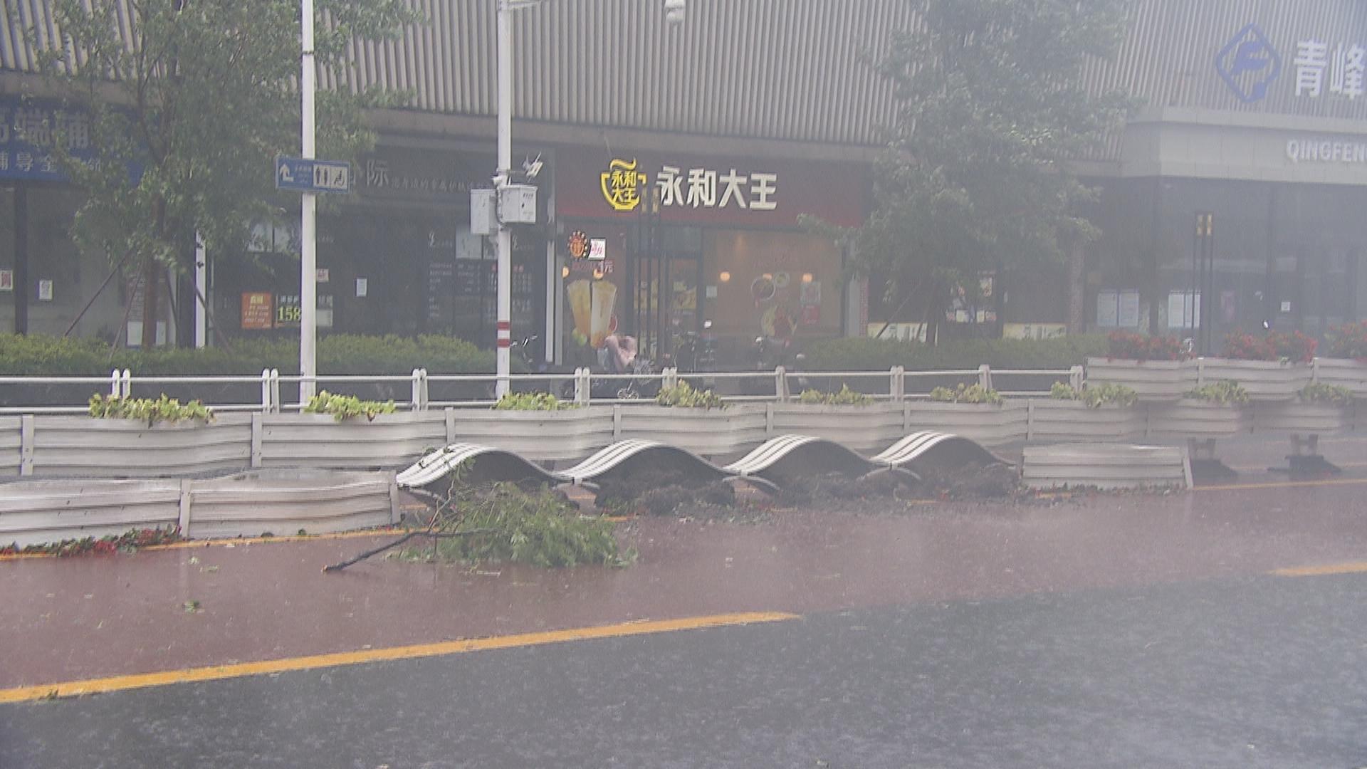 受到台风“烟花”登陆影响,我区今天的风力和雨势明显增强,部分区域的树木和道路隔离带出现了倒伏。